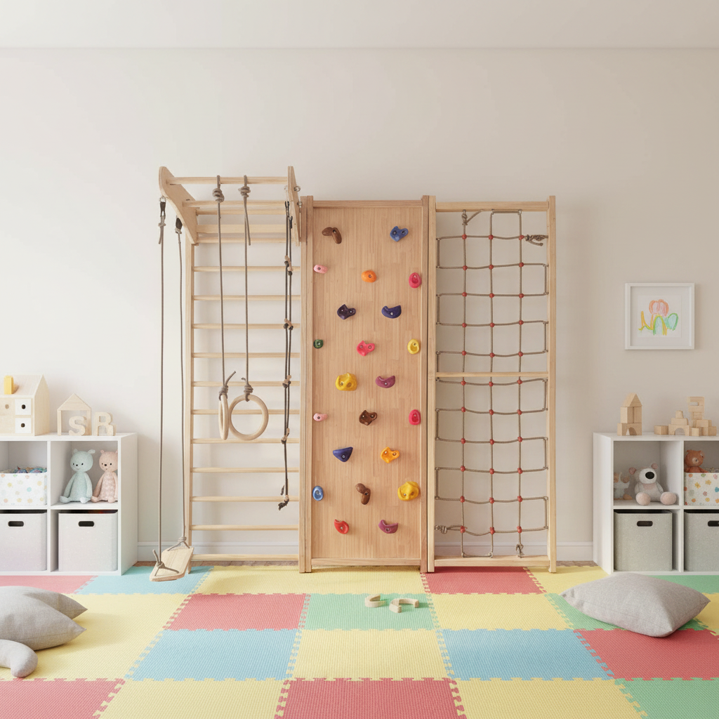 This ensures safety during active climbing, rope net use, and daily strength training.